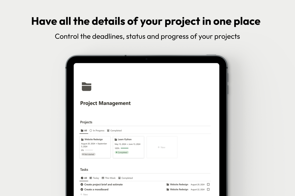 - Task Management - You can add tasks, relate them to a project, assign a date and mark them as completed.